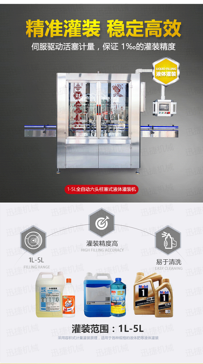 消毒液定量灌裝機應用領域:適用于食品飲料、醫藥、化工、農藥等行業中各種流動液體的灌裝。如潤滑油、消毒液、酒精、殺菌劑、溶液等。