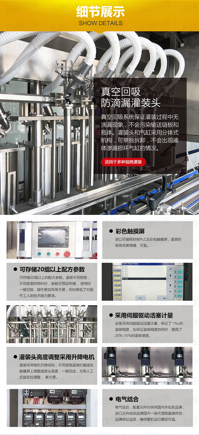 2、本機由可編程控制器(PLC)配合智能觸摸屏(人機界面)控制,人性化的設計使調整灌裝量及修改各種參數等操作均十分簡單、快捷、直觀;