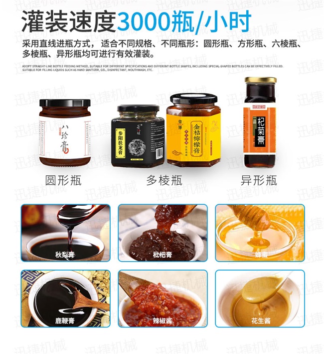 枇杷膏自動灌裝機生產(chǎn)流水線適用于各種1、各種膏滋如:秋梨膏、枇杷膏、鹿鞭膏、蜂蜜等的灌裝。2、調味醬如:香菇醬、辣椒醬、豆瓣醬、花生醬、芝麻醬、牛油火鍋底料、紅油火鍋底料。3、采用多規(guī)格的灌裝轉閥、灌裝頭,可適應不同客戶物料的灌裝需求。