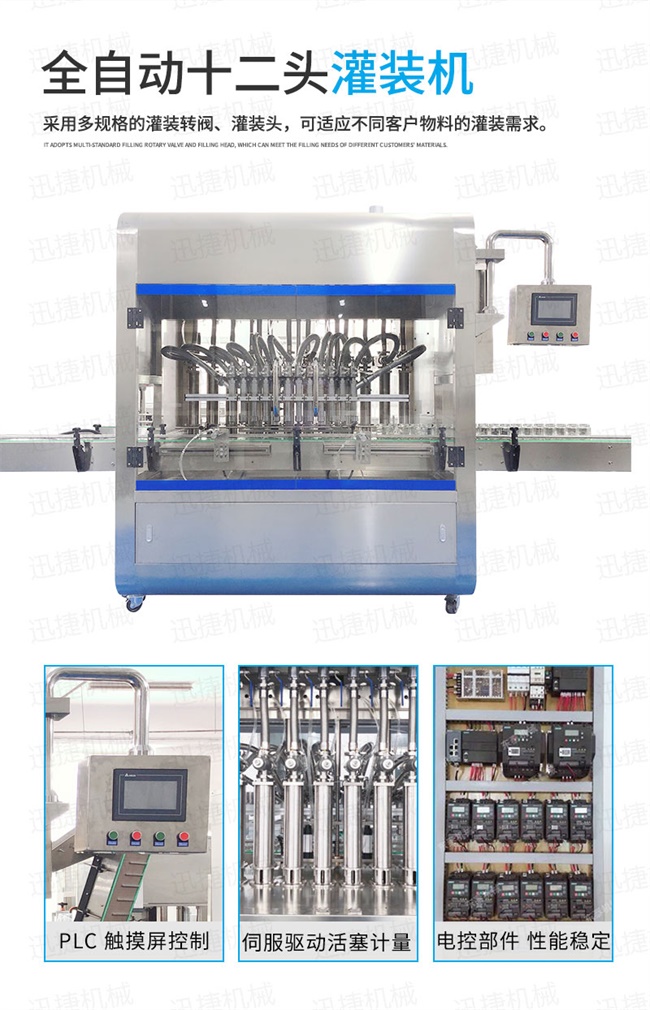 2、灌裝機以進口PLC電腦控制、伺服驅動計量,全彩色觸摸屏人機界面,一鍵完成計量切換確保容量之調整簡易、快捷、準確。是任何形式的灌裝機無法替代的;