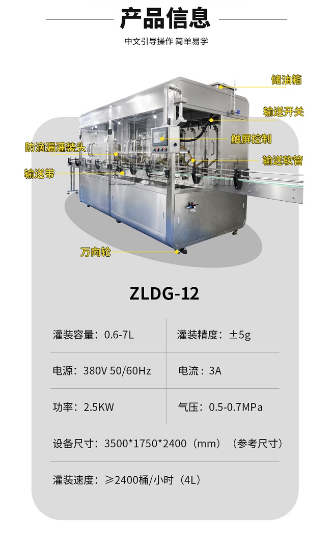 該設備主要針對油脂包裝開發的專用灌裝設備。采用東泰公司的專用灌裝系統:單頭單泵單變頻技術。該灌裝機具有灌裝速度快,精度高,無滴漏的特點。特別適合中高產能的油脂包裝企業使用。