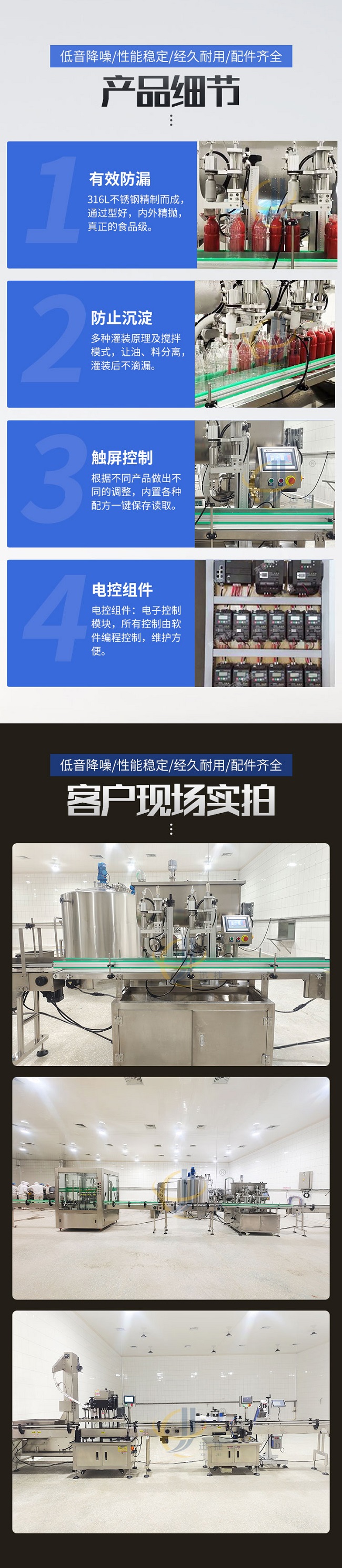 這款柱塞式辣椒醬灌裝機(jī)低音降噪、性能穩(wěn)定、經(jīng)久耐用、配件齊全,適用范圍廣泛用于辣椒醬、拌面醬、豆瓣醬、大塊肉醬、油辣醬、番茄醬花生醬、草莓醬等醬料的定量充填分裝。雙螺旋變頻攪拌,有效防止物料沉淀造成的計(jì)量不準(zhǔn)。物料通過(guò)三通轉(zhuǎn)向閥連接攪拌料箱,攪拌料箱里配置變頻攪拌系統(tǒng),攪拌系統(tǒng)讓物料在極低破壞率的情況下,得到充分的攪拌。
