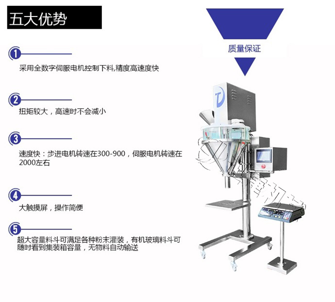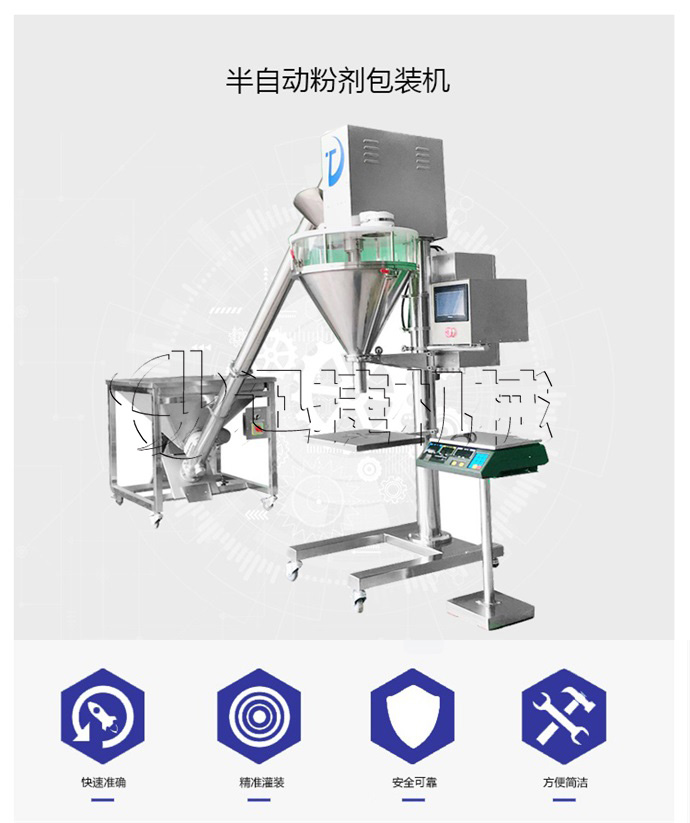 該粉劑包裝機適用于有一定流動性的粉劑狀、顆粒狀物料,可適合袋類、罐類、瓶類等各種包裝容器粉劑定量包裝,速度快、精度高。如農(nóng)藥、獸藥、預(yù)混料、添加劑、奶粉、淀粉、調(diào)味品、酶制劑、飼料等粉劑狀、雞精、餃子粉、葡萄糖、奶粉、綠豆粉、淀粉、調(diào)味料、飼料、顆粒狀物料的定量包裝。該款半自動粉劑包裝機在市場深受顧客喜愛,自然有它的優(yōu)勢,該設(shè)備提高工作效率、降低生產(chǎn)成本計量準確、包裝規(guī)格大小均可成品干凈整潔、粉塵不外粘機器性能穩(wěn)定、使用壽命長占用空間小、操作簡便、移動方便。